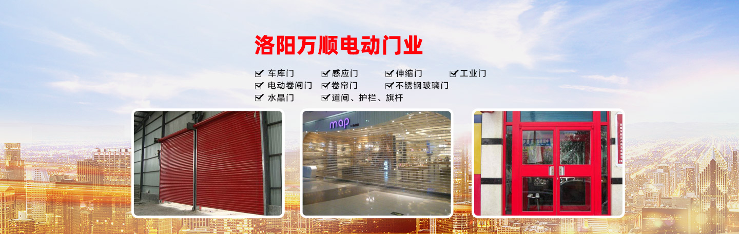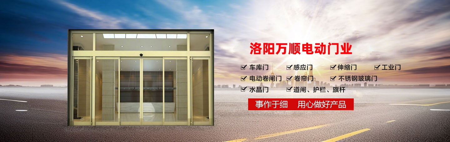 洛陽萬順電動門業位于洛陽市紗廠西路不銹鋼市場,是一家集設計、制作、銷售、安裝、服務于一體的自動門企業。公司主要經營有:洛陽玻璃門、洛陽電動門、洛陽快速卷簾門、洛陽伸縮門制作安裝維修、車庫門、感應門、工業門、電動卷閘門、不銹鋼玻璃門、水晶門、道閘、護欄、旗桿、電動門電機等系列產品,在用戶中贏得了好評及信賴,樹立了良好企業形象。